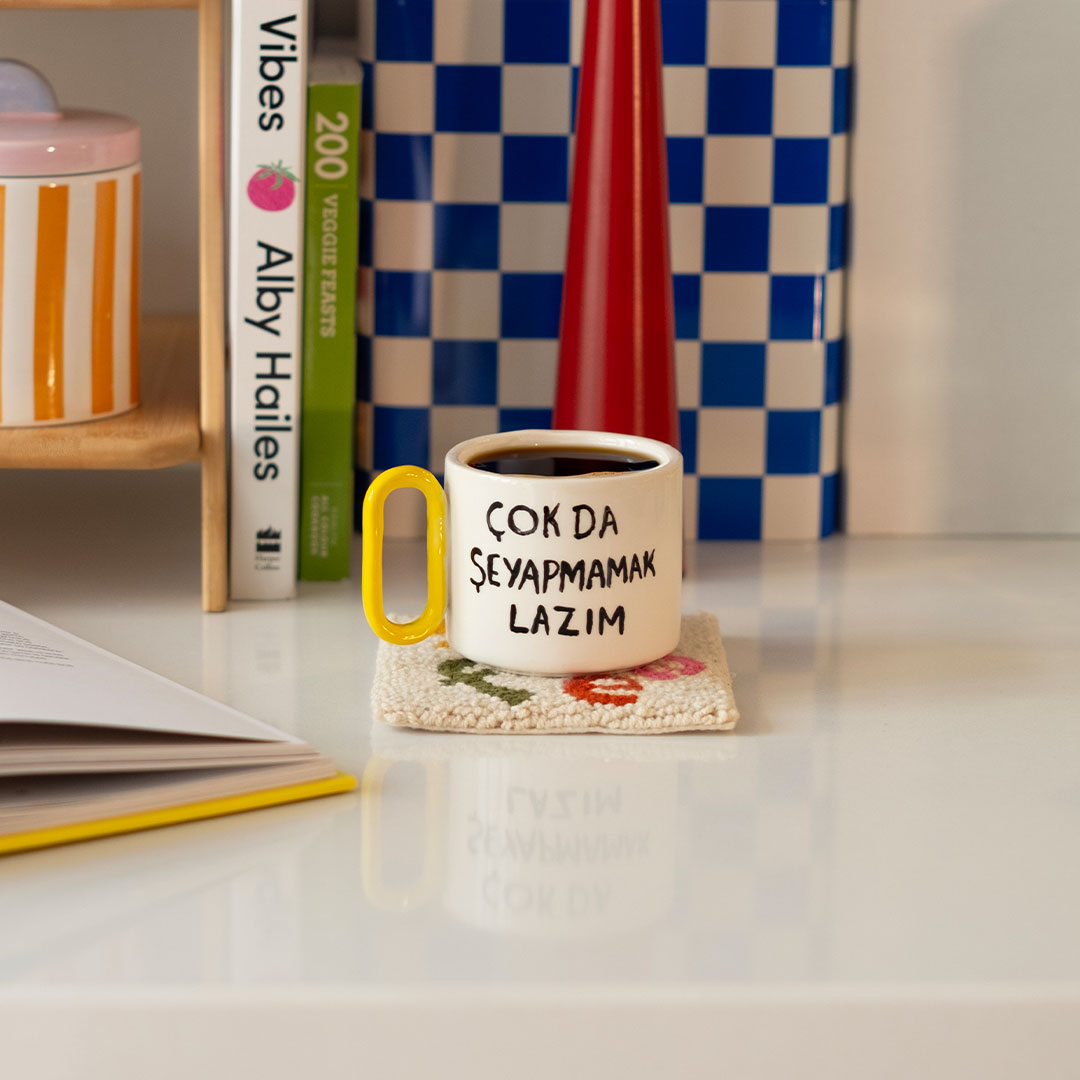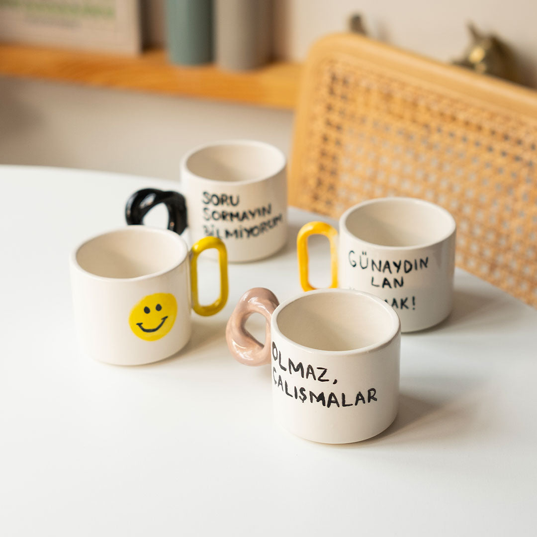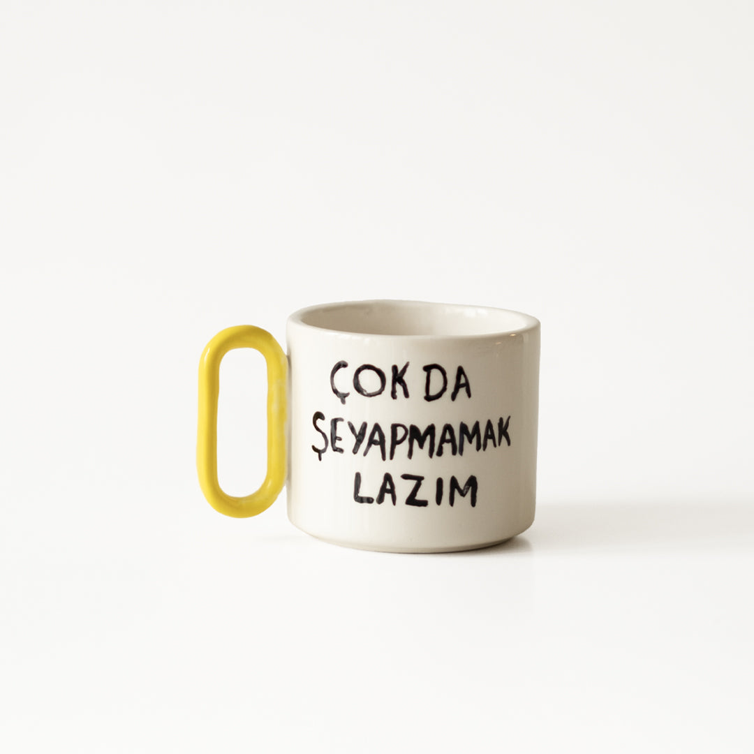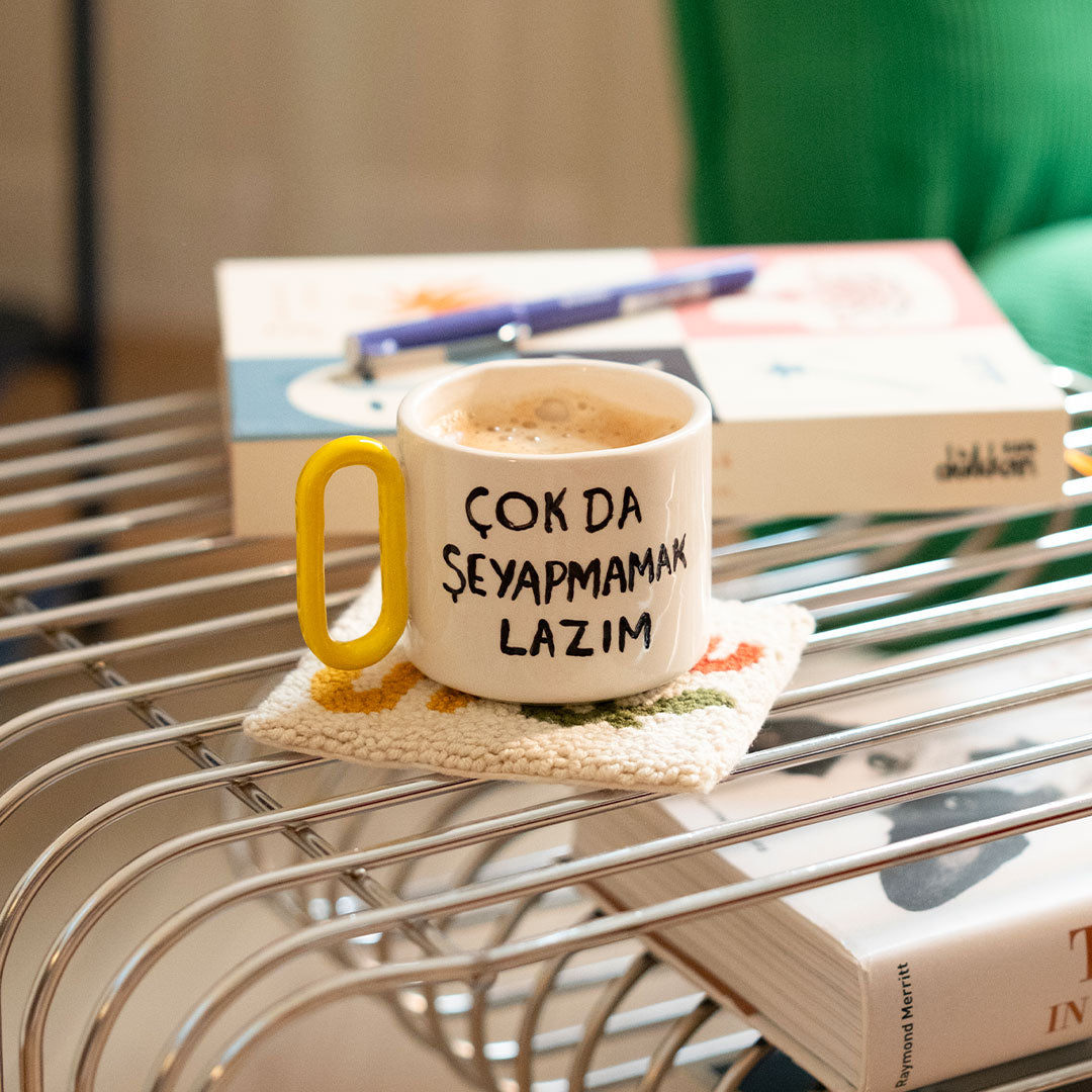 Her biri elde şekillendirilen “Çok Da Şeyapmamak Lazım” kupalar, hem mizahı hem de samimiyetiyle masanda kendine yer açıyor. Üstündeki yazı ve çizimleriyle her yudumda küçük bir tebessüm bırakır.
