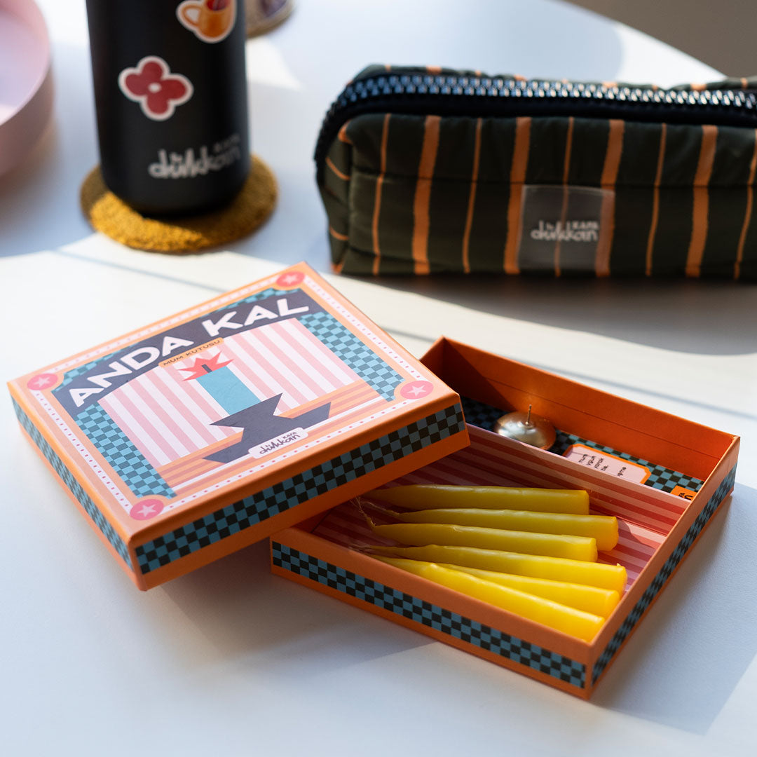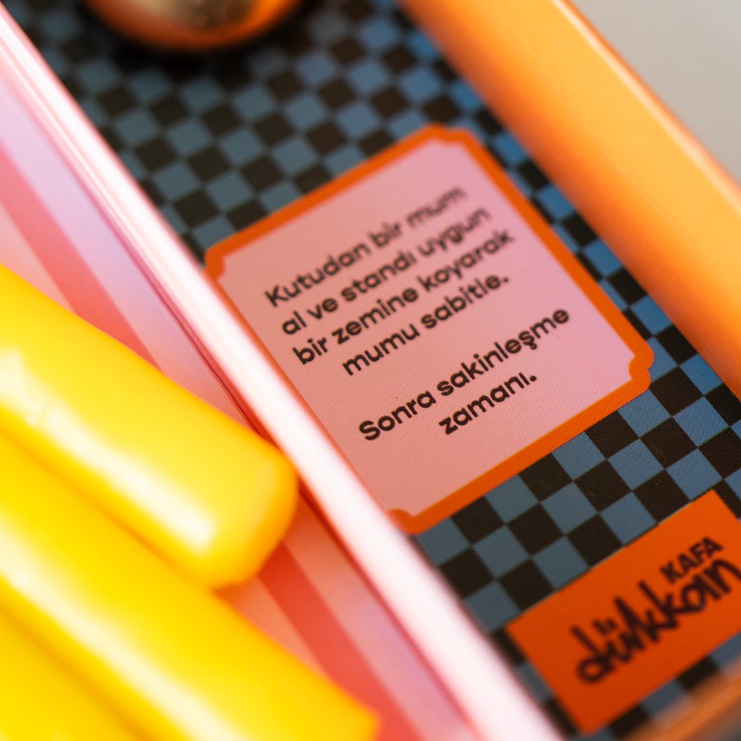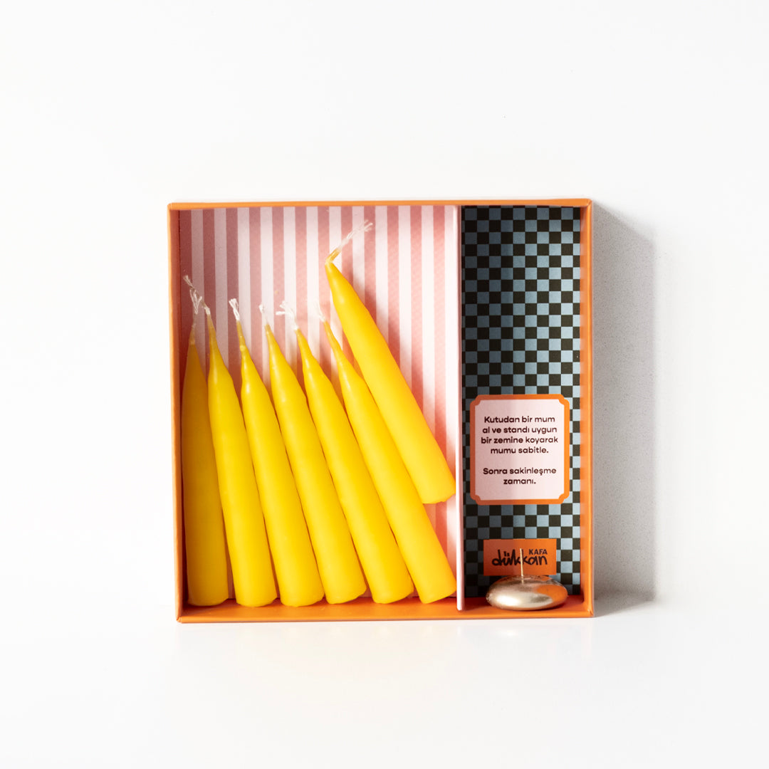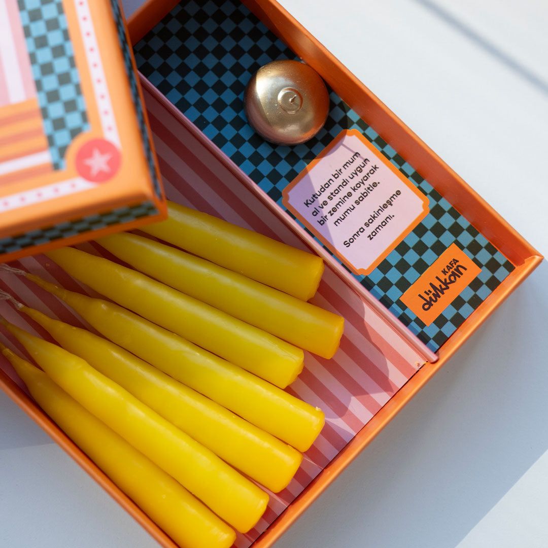 Anda Kal Mum Kutusu, durmak, nefes almak ya da sadece bir dilek tutmak istediğin anlar için tasarlandı. Kutunun içinde 7 adet 10 cm uzunluğunda şamdan mum ve bir adet mum standı bulunur. Ne zaman kendine dönmek istersen, kutuyu aç, standı yerleştir, mumu sabitle ve yak. Her alev, küçük bir sakinlik daveti; her ışık, kısa bir farkındalık molasıdır.