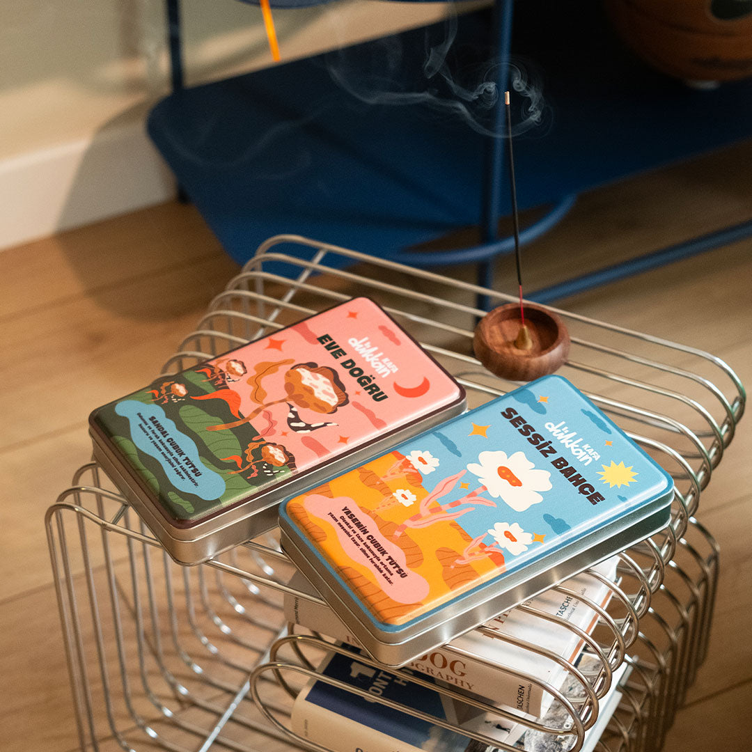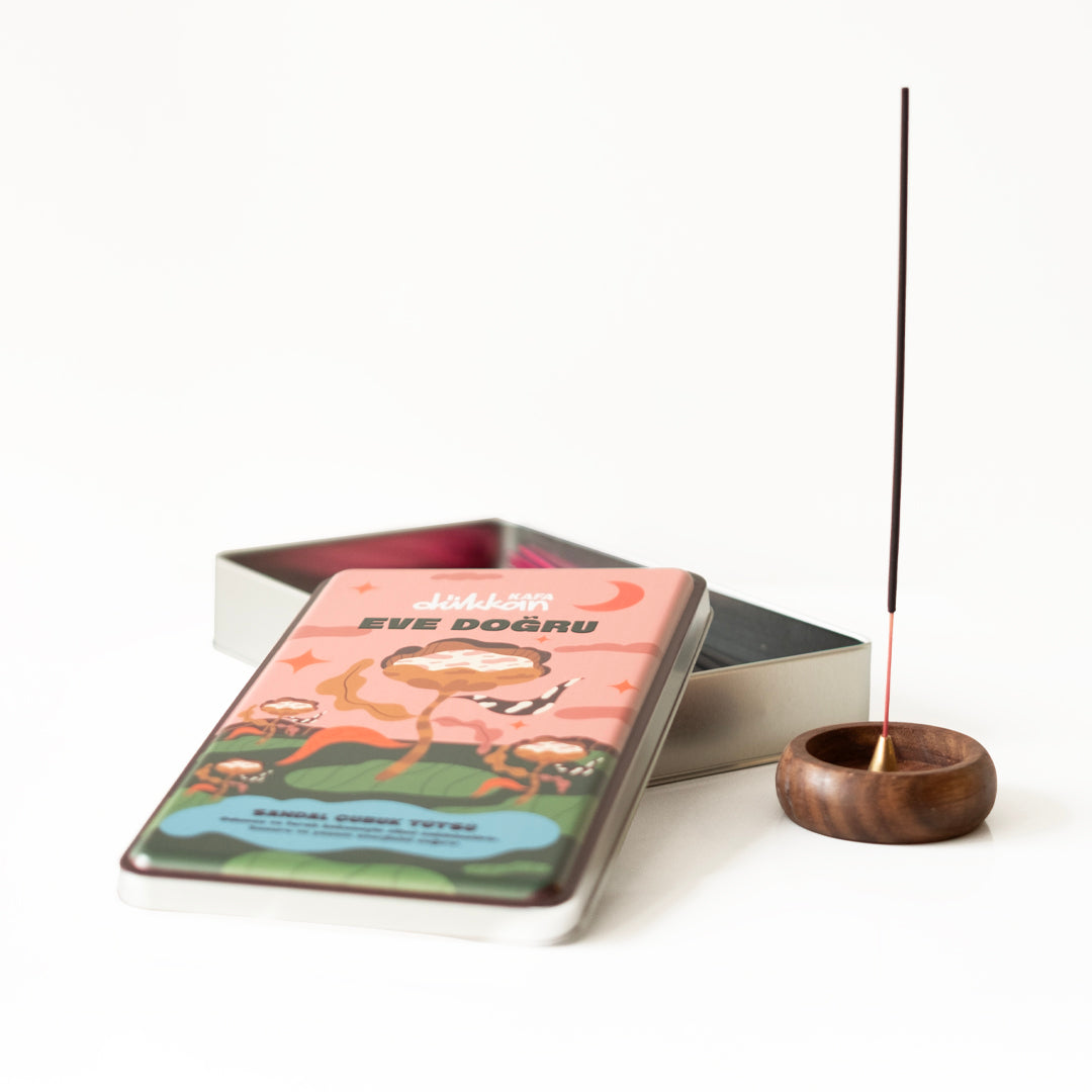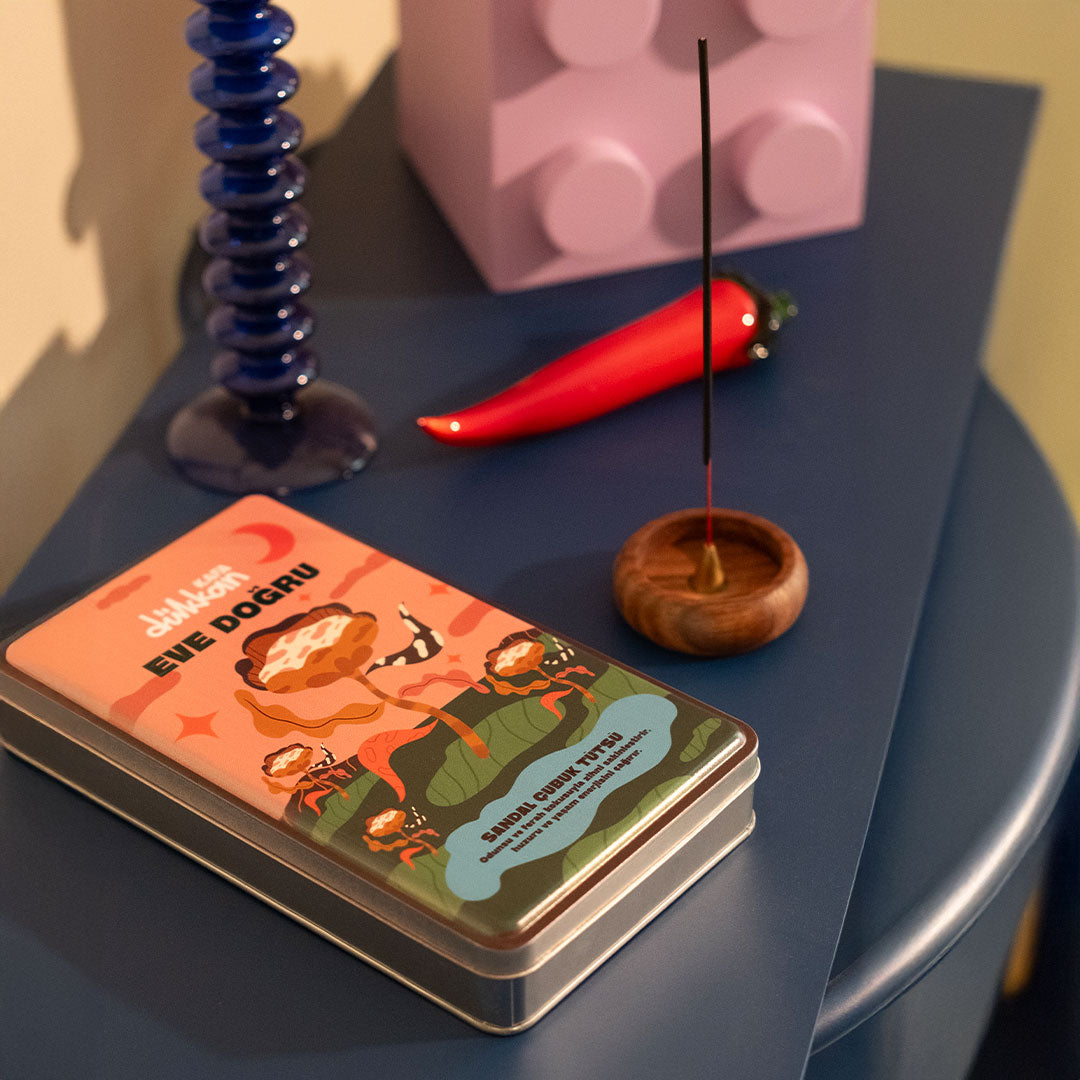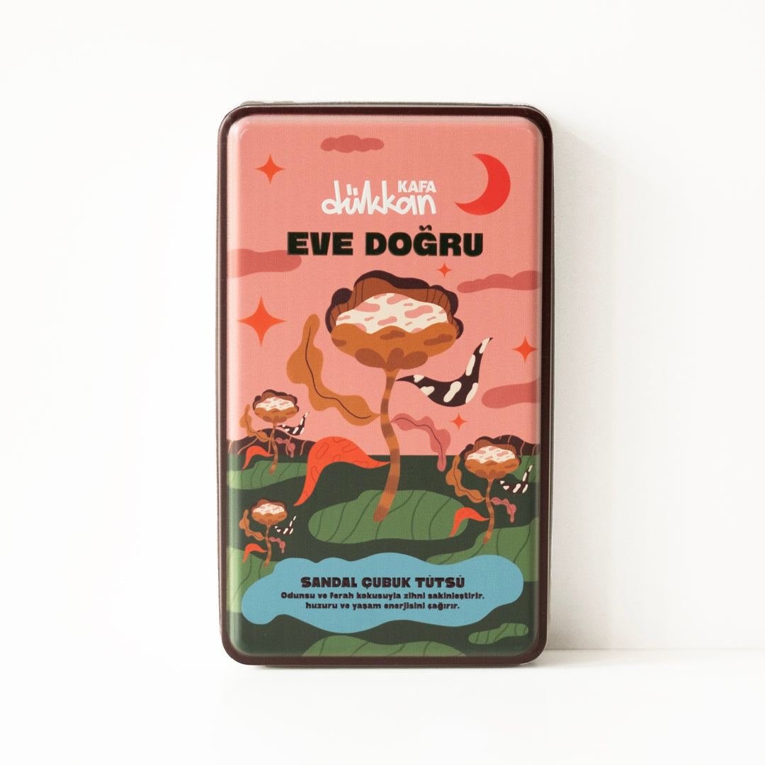 Eve Doğru, sandal ağacının sıcak ve odunsu kokusunu mekâna taşır. Metal kutunun içinde 40 adet sandal çubuk tütsü ve onları sabitleyebileceğin bir ahşap tütsülük bulunur. Sandal kokusu, zihni dinginleştirir, ortamda huzurlu bir atmosfer yaratır. Kutunun üzerindeki sade tasarım, bu sakinliğe eşlik eden zarif bir detaydır.