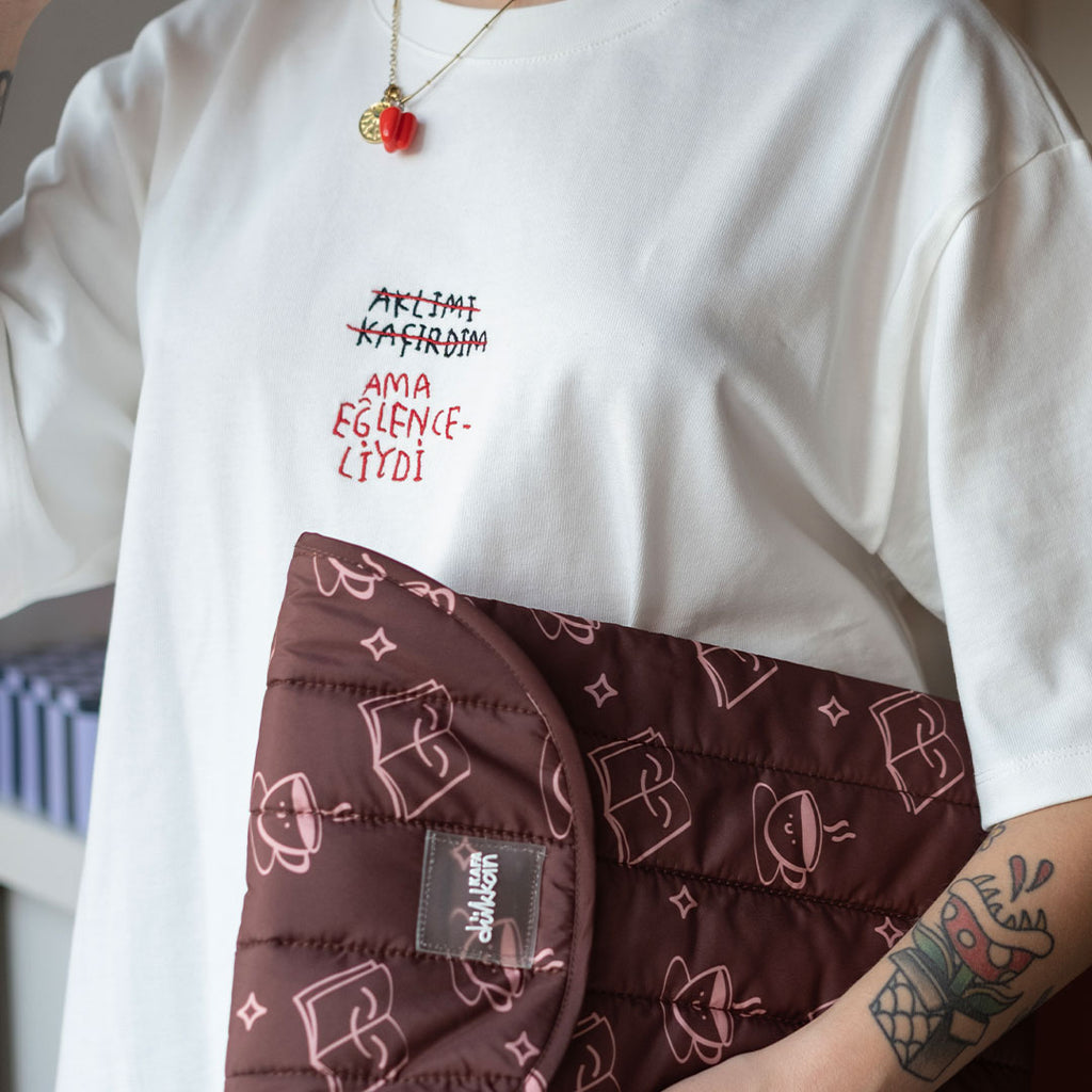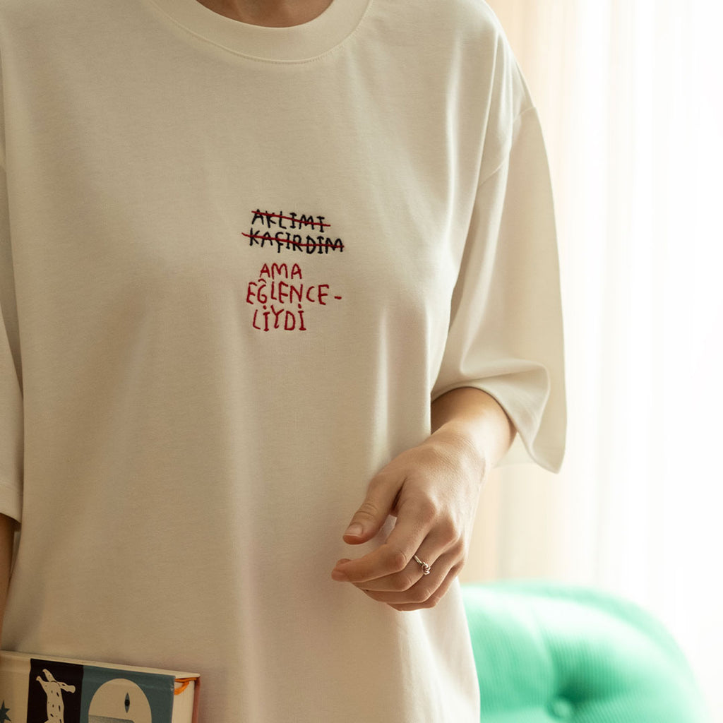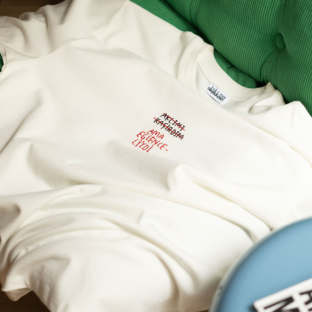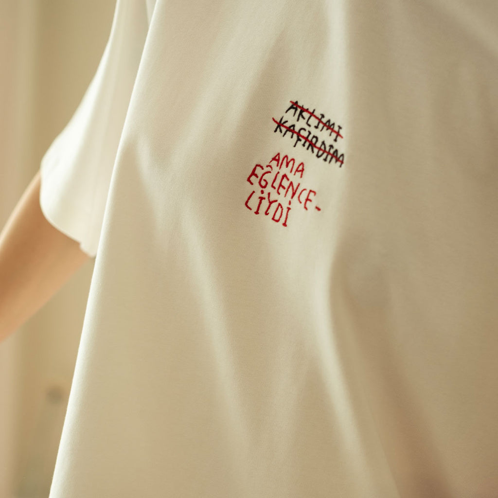 Cem Güventürk’ün karakteristik çizgilerinden ilham alan bu tişört, sade formunu ince bir mizahla buluşturur. Üzerindeki nakış detay, her bakışta küçük bir tebessüm yaratır. Rahat kesimiyle gün boyu konforlu, ruhuyla tam KAFA Dükkan’a göre: samimi, cool ve neşeli.