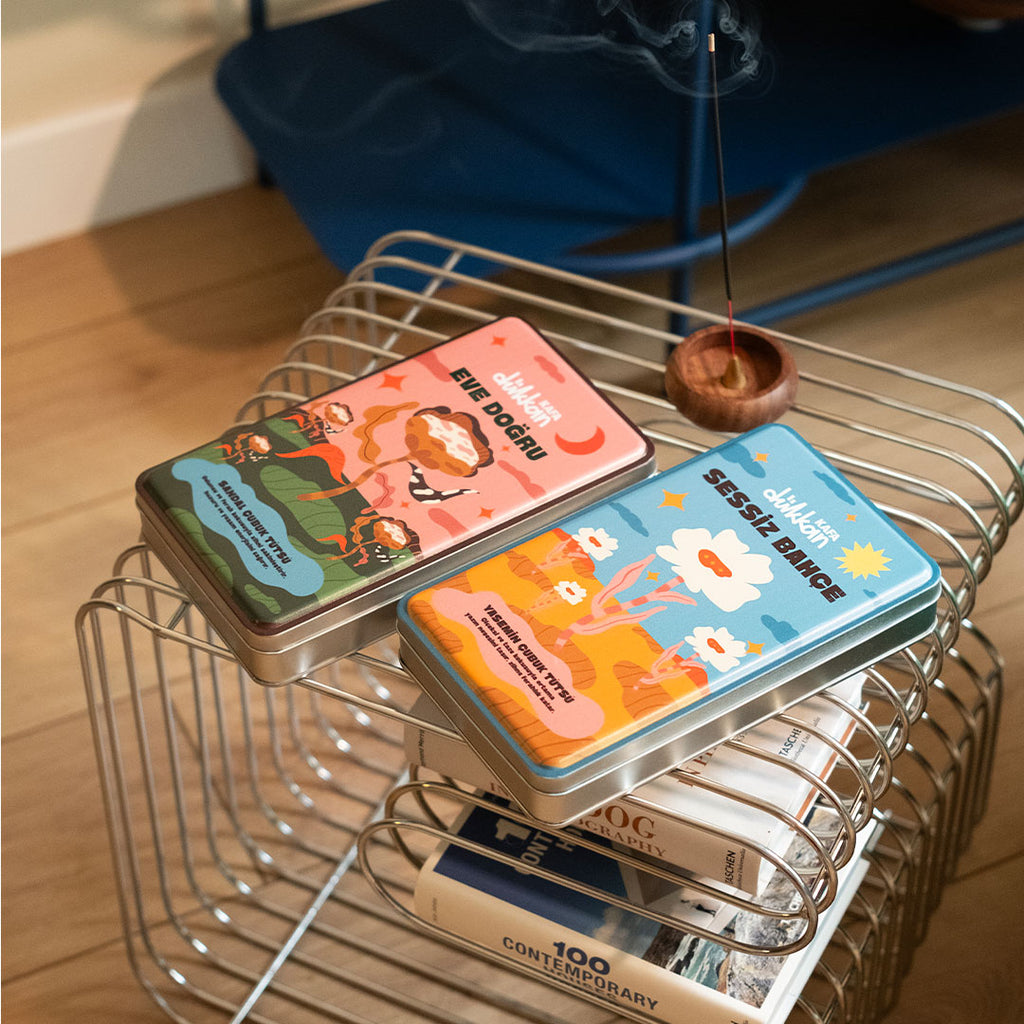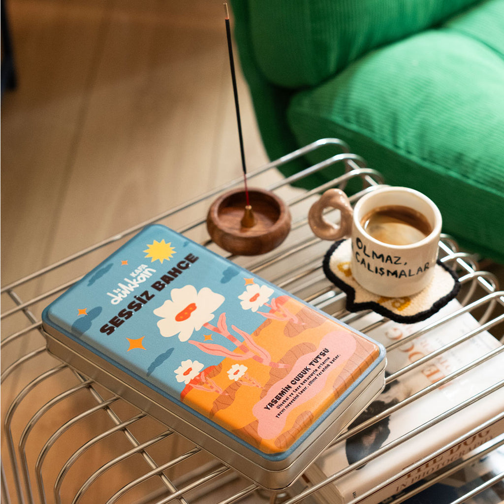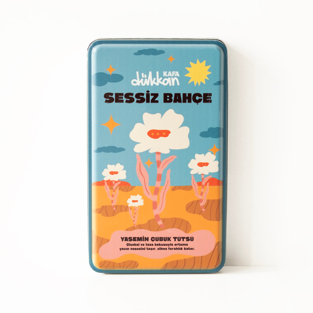 Sessiz Bahçe, yasemin kokusunun ferahlığını odana taşır. Metal kutunun içinde 40 adet yaseminli çubuk tütsü ve onları sabitleyebileceğin bir ahşap tütsülük bulunur. Çiçeksi ve taze notalarıyla ortamın havasını yeniler, zihni sakinleştirir. Kutunun üzerindeki illüstrasyon da tıpkı kokusu gibi yazın neşesini hatırlatır.